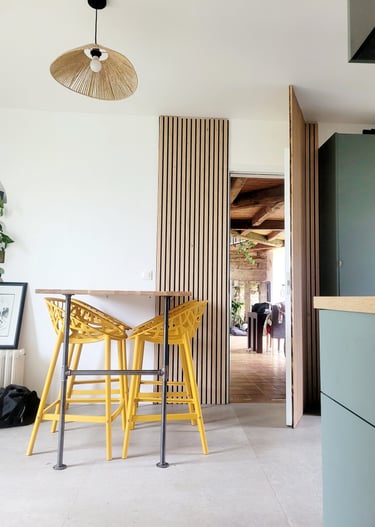 Ici, une pièce transformée grâce au bois et à la chaux, tout en créant une dynamique de lignes grâce à une ouverture surprenante et originale.